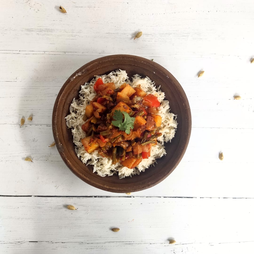 Stir well, then pour in the water, or just enough water to cover the bottom half of the vegetables. Cover with lid and simmer for 30 minutes.