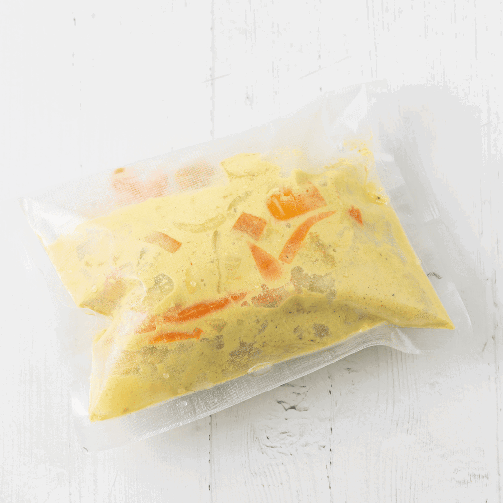 Ingredientes: Pechuga de pollo orgánico, aceite de oliva, piña, cebolla, zanahoria, ajo, sal marino sin yodo, azúcar morena, mantequilla de maní, leche de coco y especias.